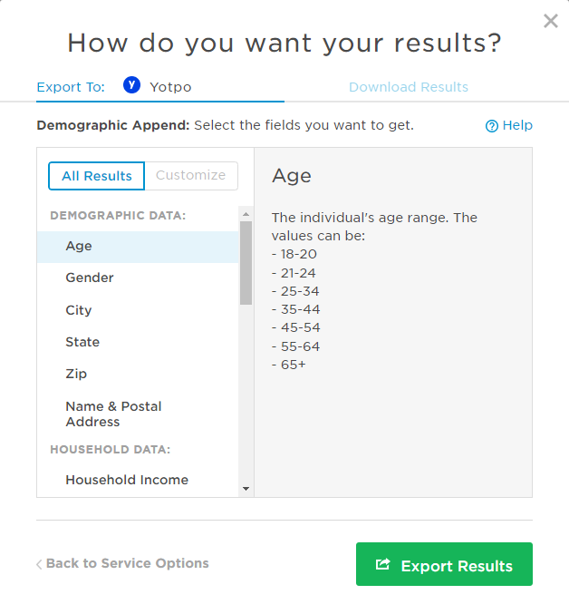 - all the demographics and behavioral data you purchase exported to Yotpo by selecting the “All Results” option