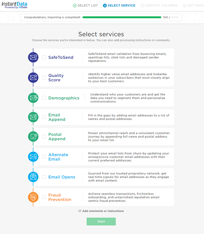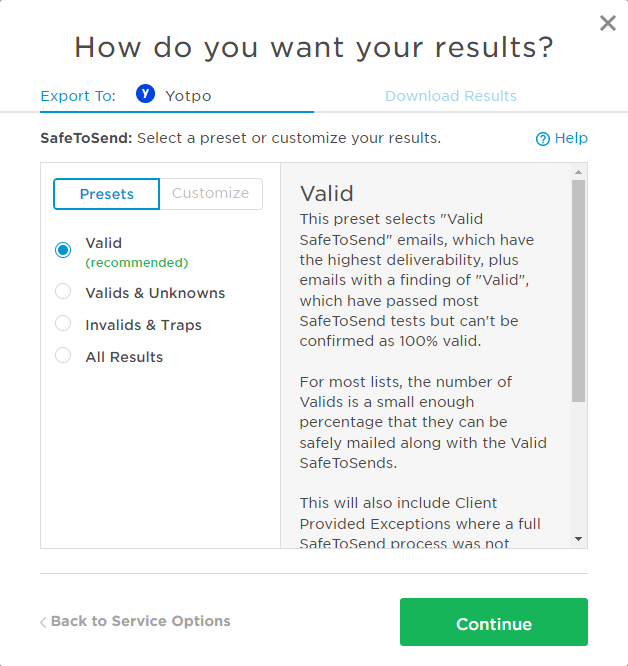 Validating the email addresses on your Yotpo list with SafeToSend® or appending demographics to them with our Demographic Append service is easy. This article covers importing your Yotpo list into InstantData for processing and exporting InstantData results back to Yotpo.