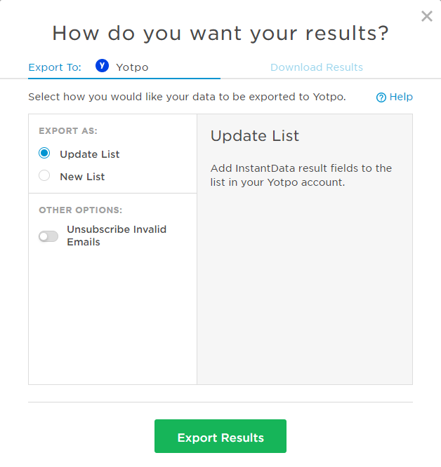 In the next pop-up you will be able to select the “Update List” or “New List” option, and then click on the button “Export Results”. If you’d rather not send the information back to Yotpo just yet, select the “Download Results” tab at the top.